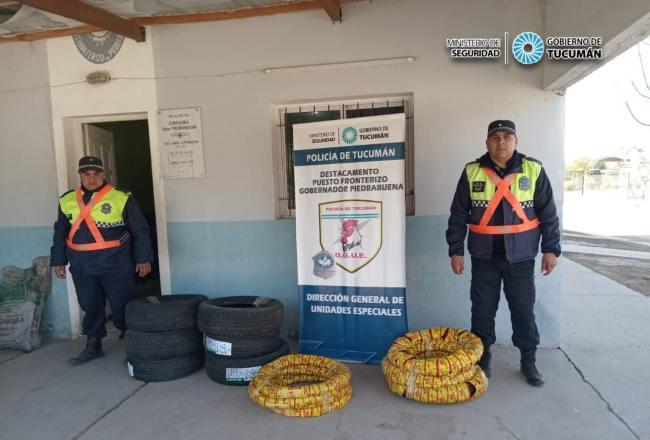 En horas de la siesta de ayer jueves, personal de Puesto Fronterizo Gobernador Piedrabuena detuvo la marcha de un conductor a bordo de una camioneta que se dirigía a la provincia de Santiago del Estero y registró tras la inspección del vehículo, catorce neumáticos de distintas marcas y rodados que eran trasladados sin la documentación respaldatoria.