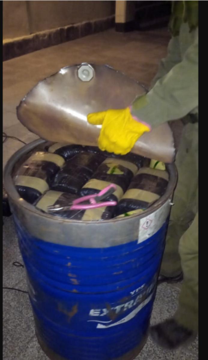 Los funcionarios iniciaron con el registro del rodado y notaron que el hombre llevaba un tambor de combustible de 200 litros cerrado en la caja del vehículo, por lo que los uniformados procedieron a someter el mismo al escáner de la Institución, el cual arrojó la existencia de cuerpos extraños en el interior.