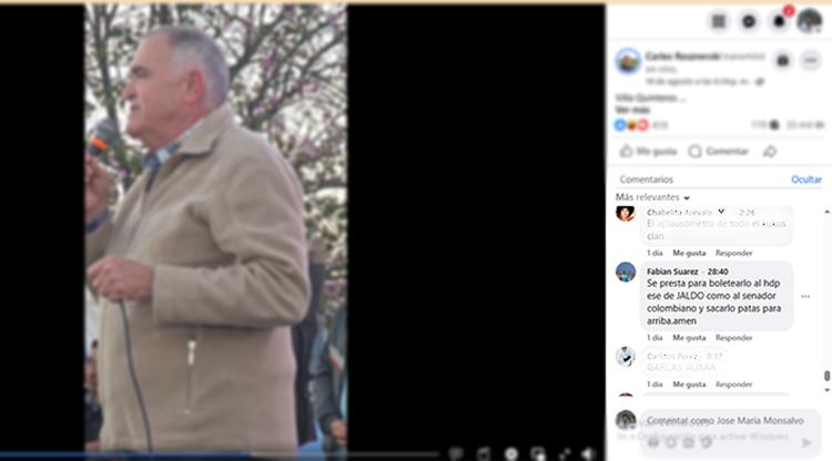 Según la investigación, cuando desde una cuenta de un usuario de Facebook se transmitía en vivo el discurso del mandatario tucumano, en los comentarios un usuario escribió: “Se presta para boletearlo al hdp (sic) ese de Jaldo como colombiano al senador y sacarlo patas para arriba. Amén”.
