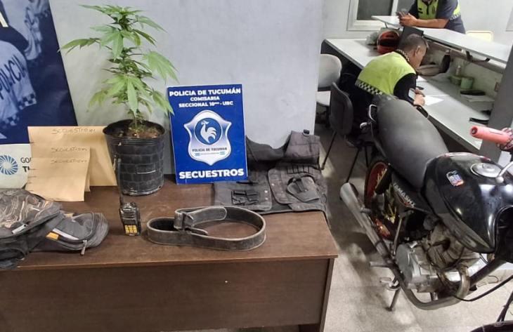 Cuando los suboficiales retornaron hacia el frente del inmueble para salir del lugar, observaron en el patio una mochila que contenía un handy, un chaleco táctico y un cinturón, como los usados por la fuerza policial. A unos metros yacía un hombre sentado sobre una reposera y, junto a él, una planta de marihuana y unos metros más lejos un frasco de vidrio con marihuana.