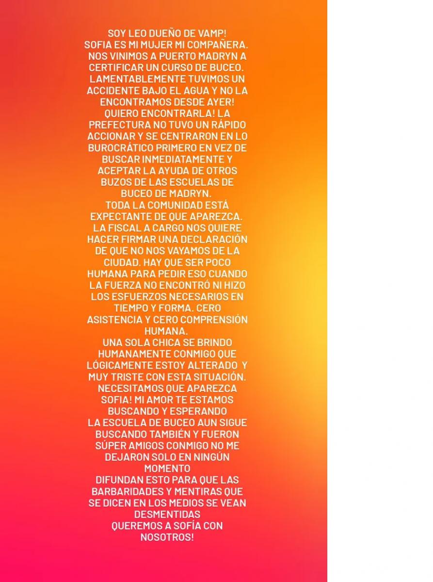 En ese contexto, Leo, el novio de la joven denunció negligencia por parte de las autoridades y pidió ayuda para encontrarla. “Lamentablemente tuvimos un accidente debajo del agua y no le encontramos desde ayer. Quiero encontrarla. La Prefectura no tuvo rápida acción y se centraron en lo burocrático primero en vez de buscar inmediatamente y aceptar la ayuda de otros buzos de la escuela de Madryn”, escribió en una historia de Instagram. (fuente: MinutoUno)
