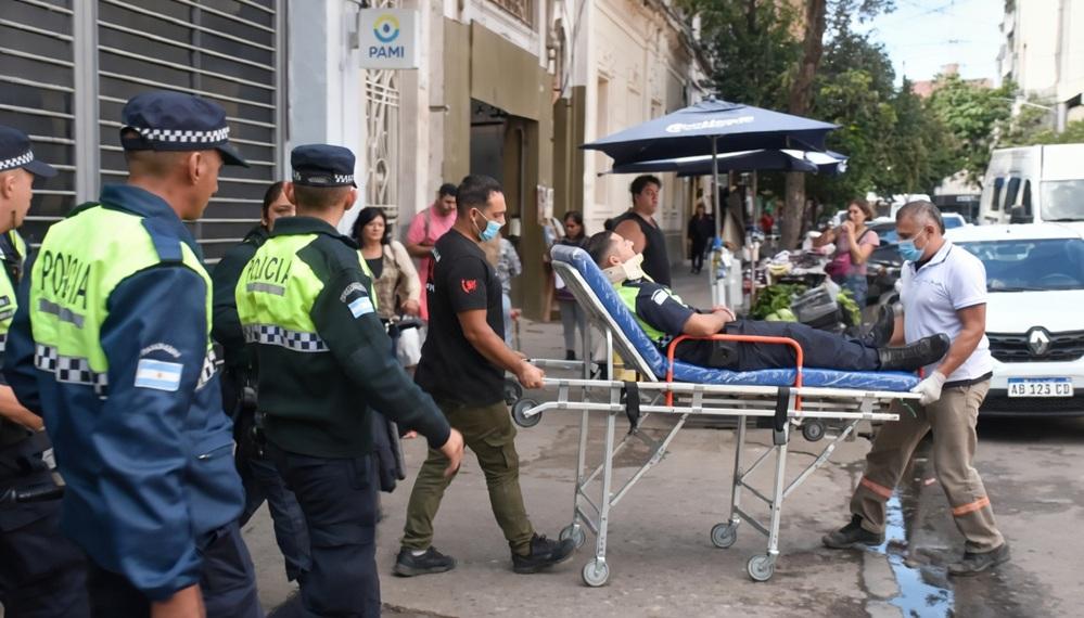 El efectivo fue retirado en camilla, con cuello ortopédico, tras presentar golpes en la cabeza y el abdomen