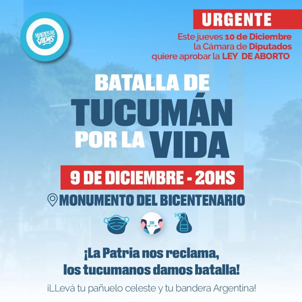 Se realiza en repudio al Proyecto de Ley de Aborto que se debate en la Cámara de Diputados de la Nación. Autoconvocados por la Vida Tucumán, realizará una manifestación a favor de la Vida Humana desde la Concepción. La convocatoria será en el Monumento del Bicentenario, hoy miércoles 9 de diciembre a las 20 horas.