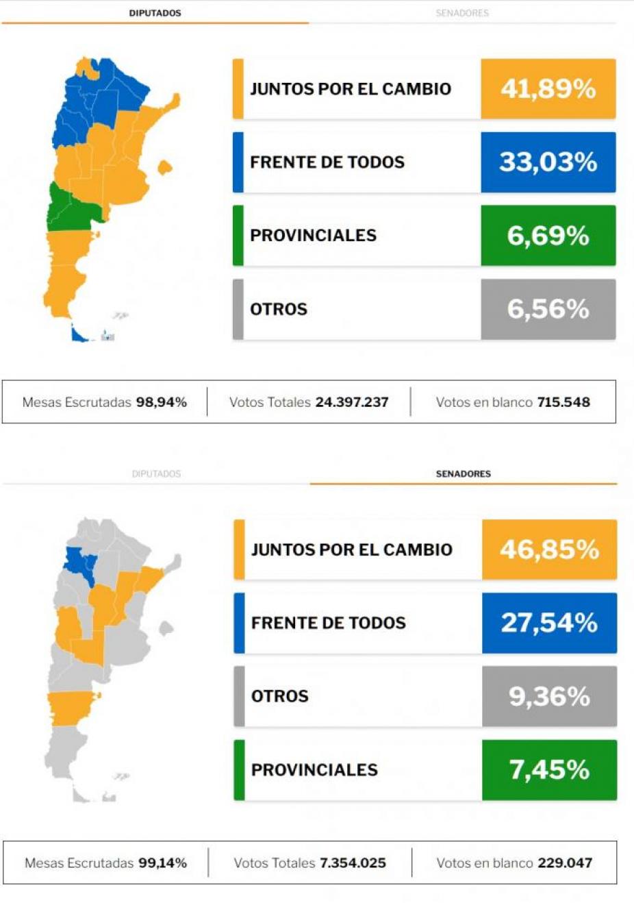Por su parte, el oficialismo hizo lo propio en: Chacho, Tierra del Fuego, Tucumán, Catamarca, La Rioja, Salta, San Juan, Santiago del Estero y Formosa. ¿Cómo queda la Cámara de Senadores? Uno de los datos más importantes que nos dejaron los comicios, es que la administración de Fernández perderá el quórum propio en el Senado, algo que no le ocurría la peronismo desde le regreso de la democracia.