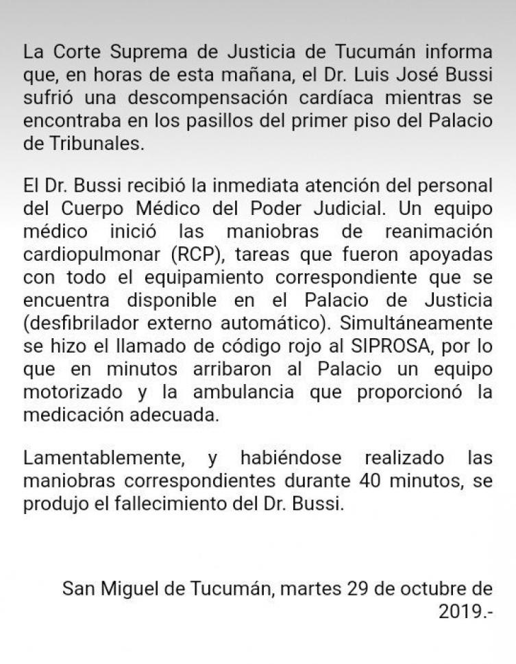 Comunicado oficial de la corte sobre el fallecimiento de Bussi