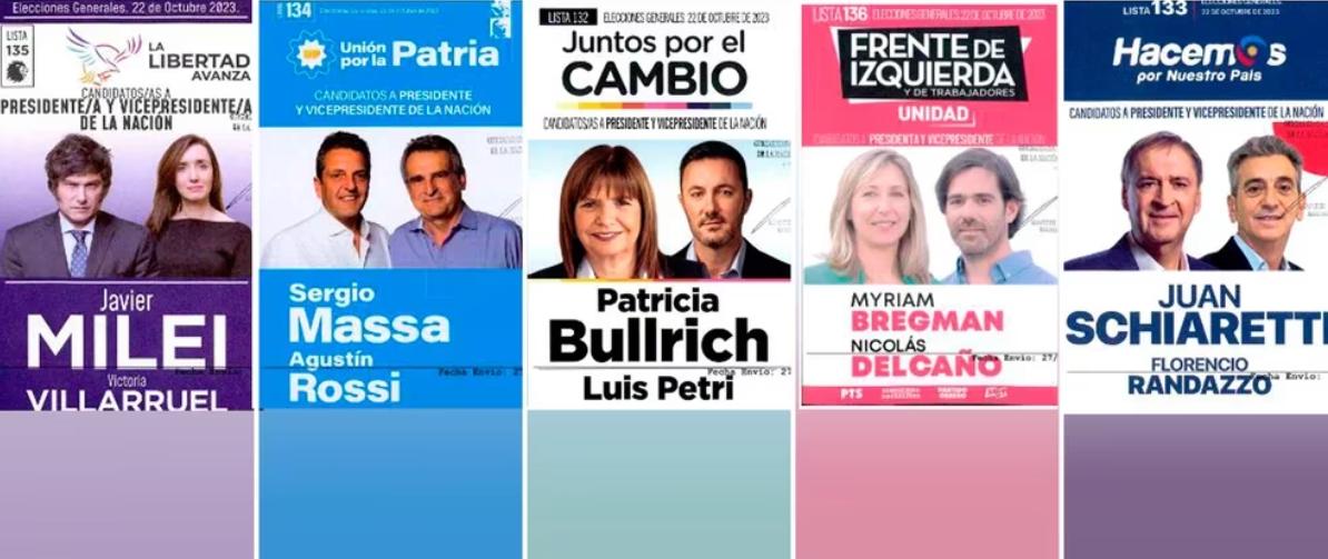 Las elecciones generales en Argentina serán este domingo 22 de octubre. Se presentan cinco candidatos a presidente, cada uno con su visión y propuestas para definir el futuro de la nación. Sergio Massa, Javier Milei, Patricia Bullrich, Juan Schiaretti y Myriam Bregman competirán por la oportunidad de suceder a Alberto Fernández a partir del 10 de diciembre.