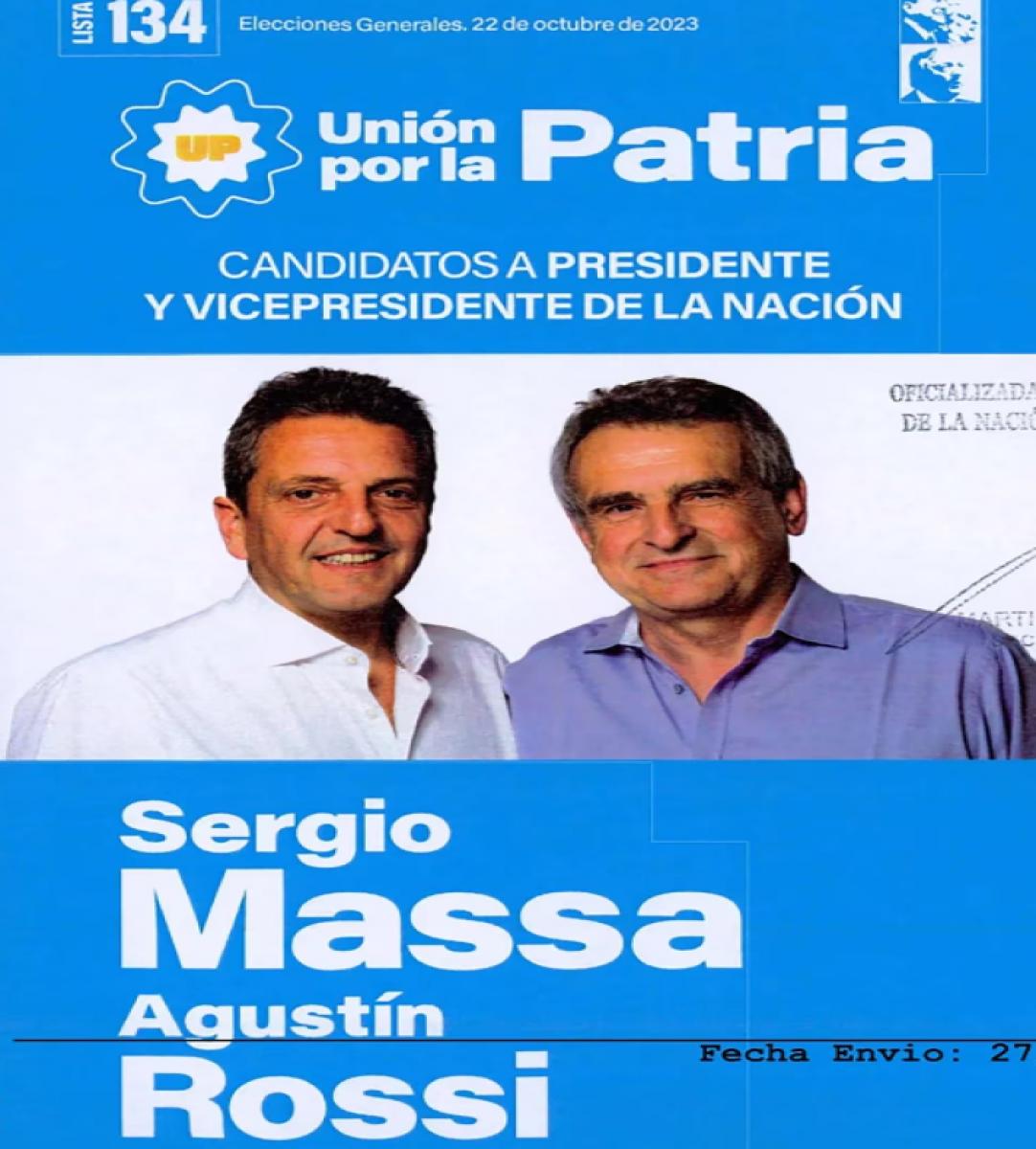 Sergio Massa, actual ministro de Economía de la Nación, es el candidato a la presidencia de Unión por la Patria, la coalición oficialista que se originó a partir del Frente de Todos. En las elecciones primarias, obtuvo el 27,28 por ciento de los votos, compitiendo en la interna junto a Juan Grabois, y quedando en tercer lugar detrás de LLA y JxC.