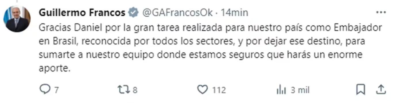 El titular de Interior anunció la incorporación a través de su cuenta de X (exTwitter), en donde publicó una foto que se lo ve junto al dirigente peronista y el presidente Javier Milei. “Gracias Daniel por la gran tarea realizada para nuestro país como Embajador en Brasil, reconocida por todos los sectores, y por dejar ese destino, para sumarte a nuestro equipo donde estamos seguros de que harás un enorme aporte”, escribió Francos.