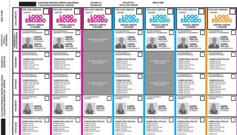 El modelo mendocino, que el Senado tomó como referencia cuando modificó el texto que se había aprobado en Diputados (inspirado en el modelo de la provincia de Córdoba), ubica los cargos sobre el margen izquierdo de manera horizontal y los partidos o alianzas en filas verticales con diferentes colores.