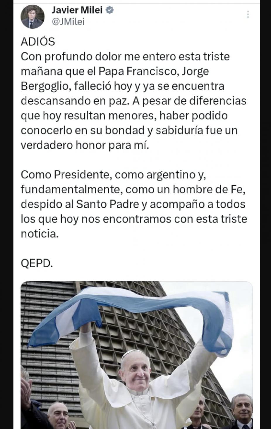 “ADIÓS. Con profundo dolor me entero está triste mañana que el Papa Francisco, Jorge Bergoglio, falleció hoy y ya se encuentra descansando en paz. A pesar de diferencias que hoy resultan menores, haber podido conocerlo en su bondad y sabiduría fue un verdadero honor para mí. Como Presidente, como argentino y, fundamentalmente, como un hombre de Fe, despido al Santo Padre y acompaño a todos los que hoy nos encontramos con esta triste noticia. QEPD.”