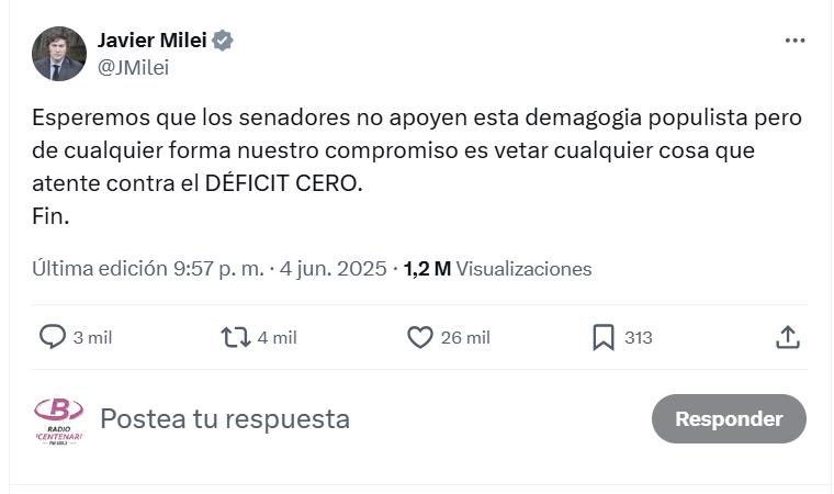 "Esperemos que los senadores no apoyen esta demagogia populista pero de cualquier forma nuestro compromiso es vetar cualquier cosa que atente contra el DÉFICIT CERO. Fin.", escribió Milei en su cuenta de X (ex Twitter).