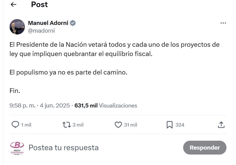 "El Presidente de la Nación vetará todos y cada uno de los proyectos de ley que impliquen quebrantar el equilibrio fiscal. El populismo ya no es parte del camino. Fin", precisó Adorni en X.