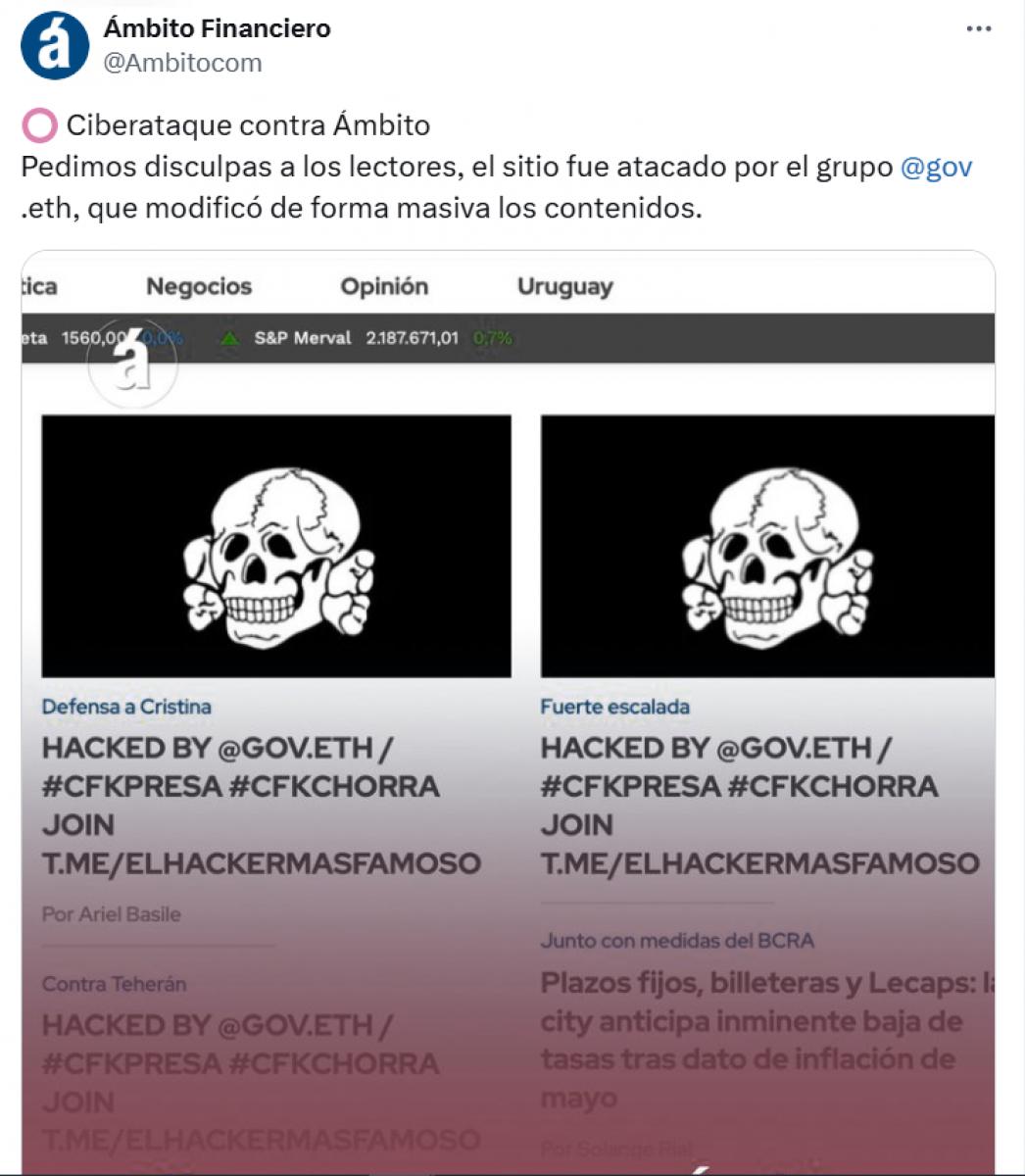 El sitio web del diario Ámbito fue hackeada este viernes por la mañana, con alusiones a la confirmación de la condena contra la expresidenta Cristina Kirchner.