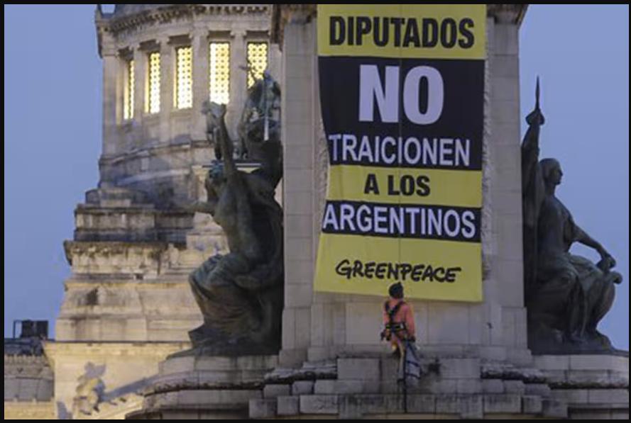 Son nueve las personas que atravesaron las rejas de la plaza para treparse de la escultura. Dos de ellas se colgaron con un arnés e instalaron un cartel de Greenpeace que dice: “Diputados, no traicionen a los argentinos”.
