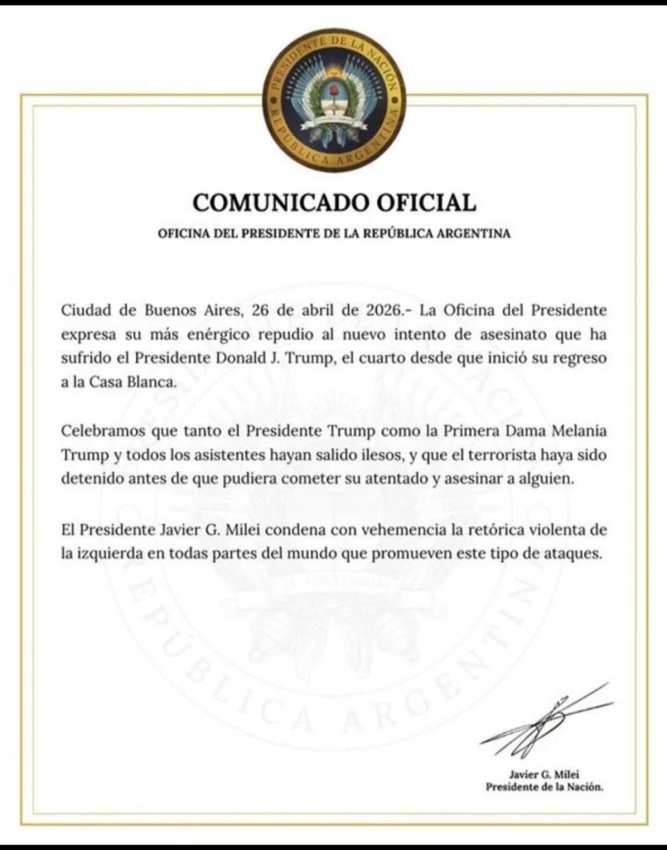 El Gobierno de Javier Milei condenó el tiroteo ocurrido durante una cena de periodistas en el hotel Washington Hilton, en Estados Unidos, evento al que asistía el presidente Donald Trump, quien fue evacuado y resultó ileso tras el episodio.