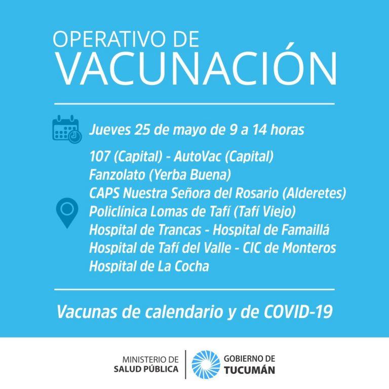 | Los lugares que estarán disponibles para la inoculación son: 107 (Capital) Autovac (Capital) Fanzolato (Yerba Buena) Caps Nuestra Señora del Rosario (Alderetes) Policlínica Lomas de Tafí (Tafí Viejo) Hospital de Trancas Hospital de Famaillá Hospital de Tafí del Valle CIC Monteros Hospital de la Cocha |