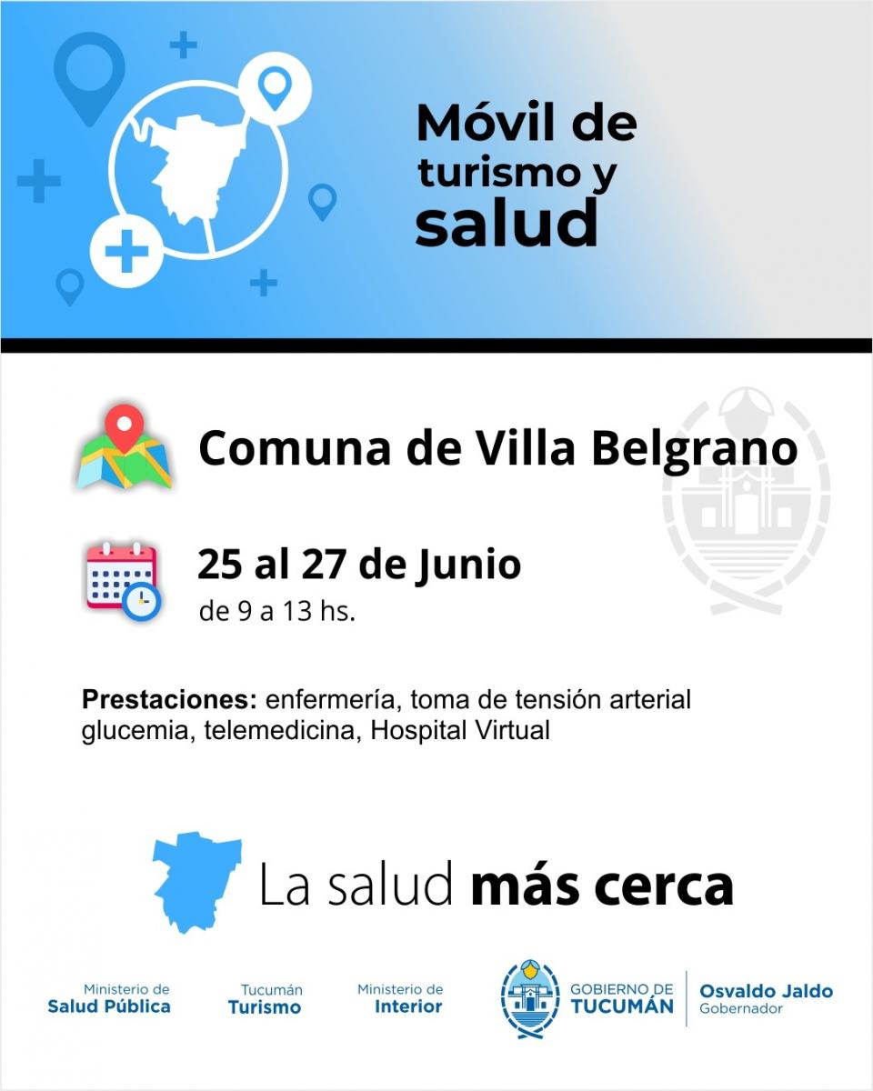 Bajo la premisa del gobernador, Osvaldo Jaldo,,de estar siempre cerca de la comunidad, el tráiler del ministerio de Salud, a cargo del doctor Luis Medina Ruiz, tiene por objetivo llegar a todos los lugares turísticos de la provincia, está semana se apostará en la Comuna de Villa Belgrano, del 25 al 27 de junio, de 9 a 13 horas.