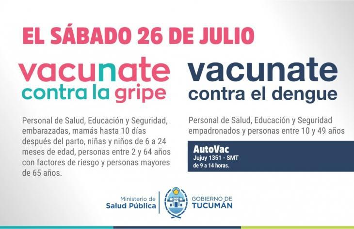 Este sábado 26 de julio, el Ministerio de Salud Pública de Tucumán llevará adelante una nueva jornada de vacunación gratuita destinada a prevenir dos enfermedades estacionales: la gripe y el dengue. La actividad se desarrollará de 9 a 14 horas en el Autovac, ubicado en calle Jujuy 1351, San Miguel de Tucumán, en el horario de 9 a 14 horas