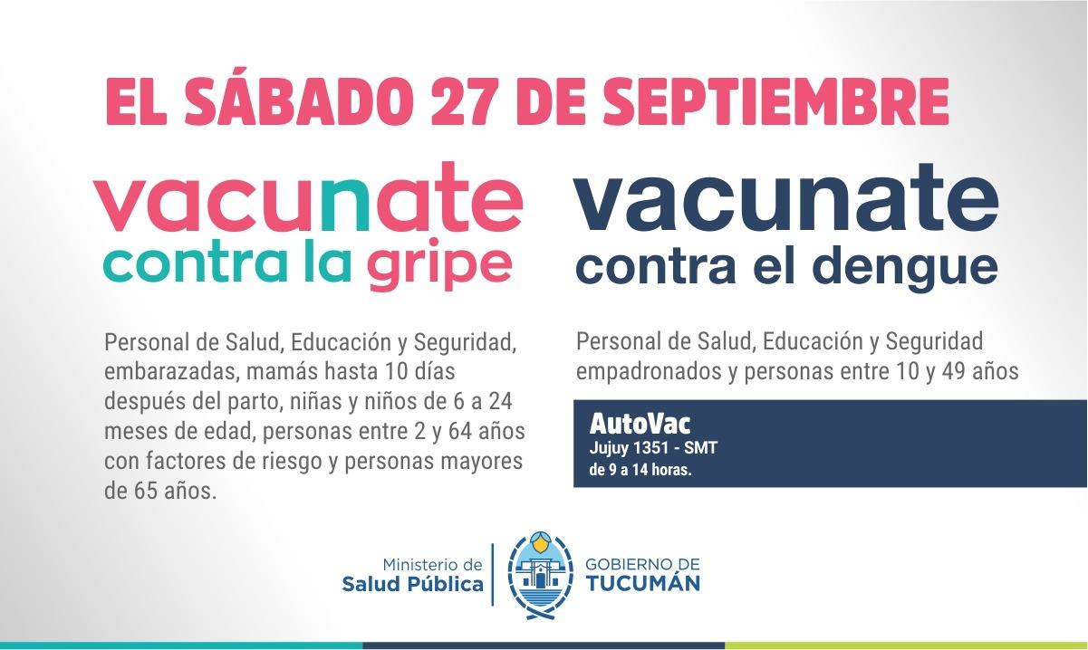 Este sábado 27 de septiembre el Ministerio de Salud Pública de Tucumán, a cargo del doctor Luis Medina Ruiz, llevará adelante una nueva jornada de vacunación gratuita, destinada a prevenir dos enfermedades estacionales: la gripe y el dengue.