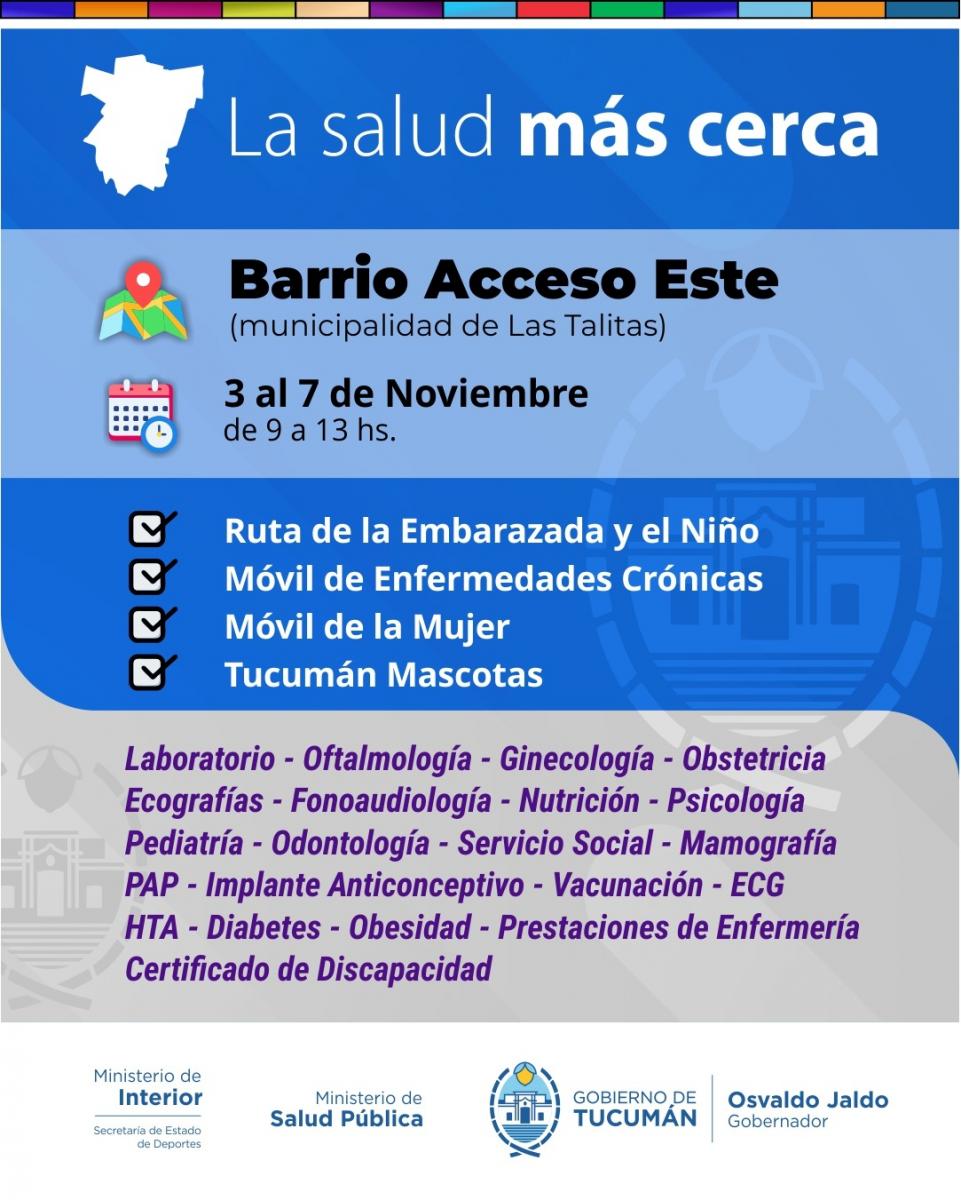 Las unidades móviles de la Mujer, de la Embarazada, de Enfermedades Crónicas y el Operativo Tucumán Mascotas del Ministerio de Salud Pública, a cargo del ministro Luis Medina Ruiz, se ponen al servicio de la población en el Barrio Acceso Este de Las Talitas, del 3 al 7 de noviembre de 9 a 13 horas.