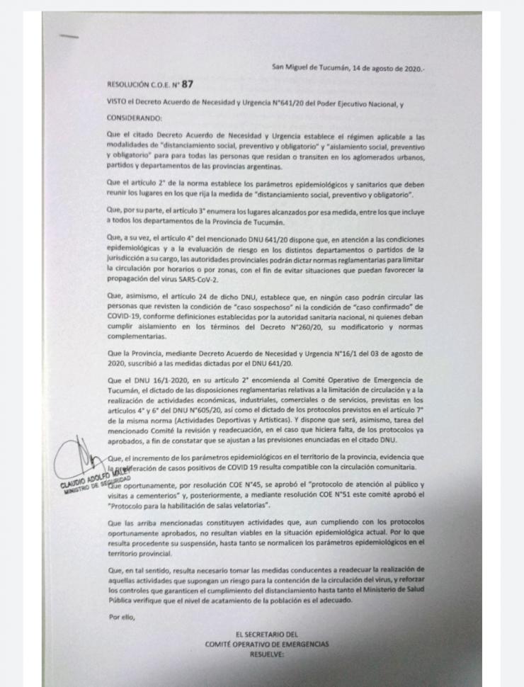 Esta resolución firmada y redactada por el Ministro de Seguridad Claudio Adolfo Maley informa que la decisión, se debe al incremento de los parametros epidemiólogicos en el territorio de la provincia que evidencia la proliferación de casos positivos de Covid 19 y que resultan compatible con la circulación comunitaria