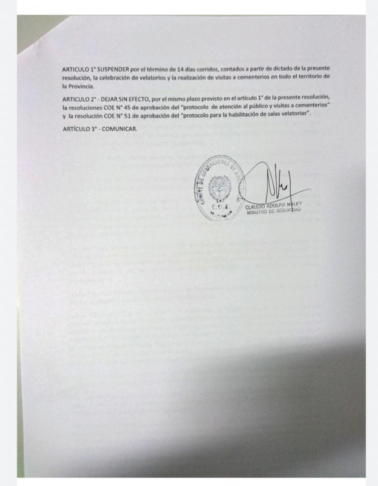 Resulta precedente la suspensión de salas velatorios y visitas a los cementerios, a partir del dia de hoy y hasta que se normalicen los parametros epidemiólogicos en el territorio provincial
