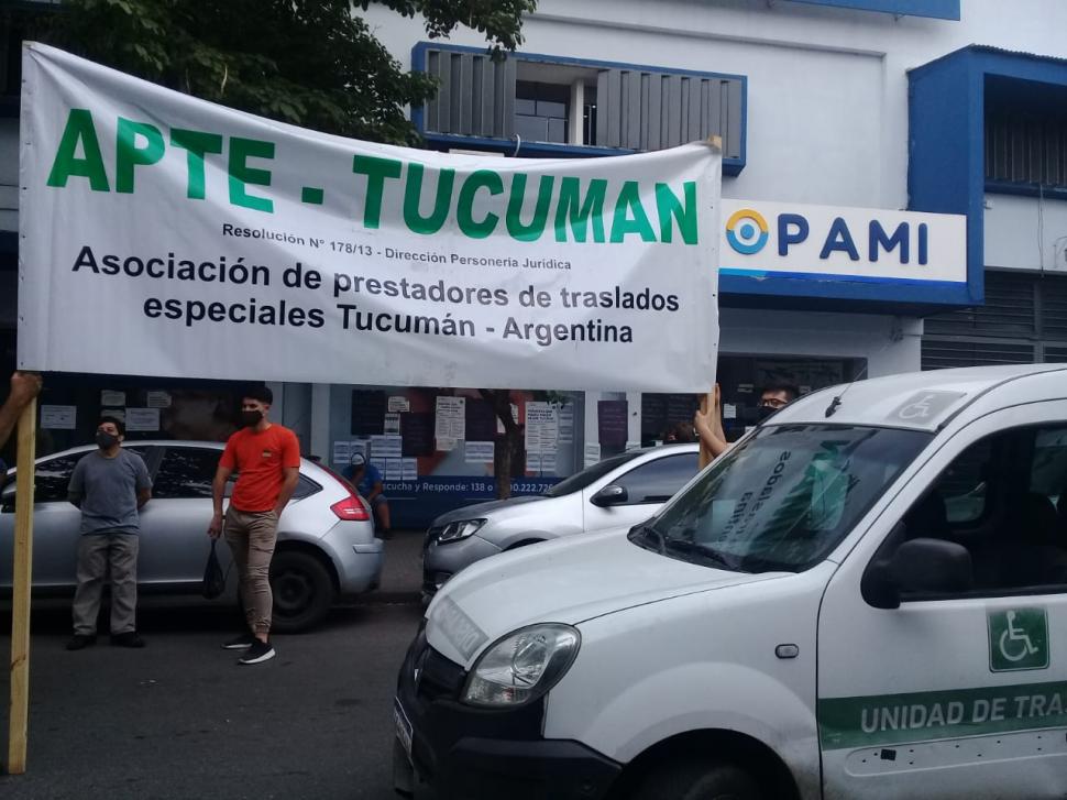 Transportistas especiales este lunes por la mañana realizan una protesta frente a la delegación local del PAMI, en calle Córdoba al 900 para exigir a la obra social nacional el pago de prácticamente todo el año 2020 de servicios de traslados programados que prestaron a sus beneficiarios.