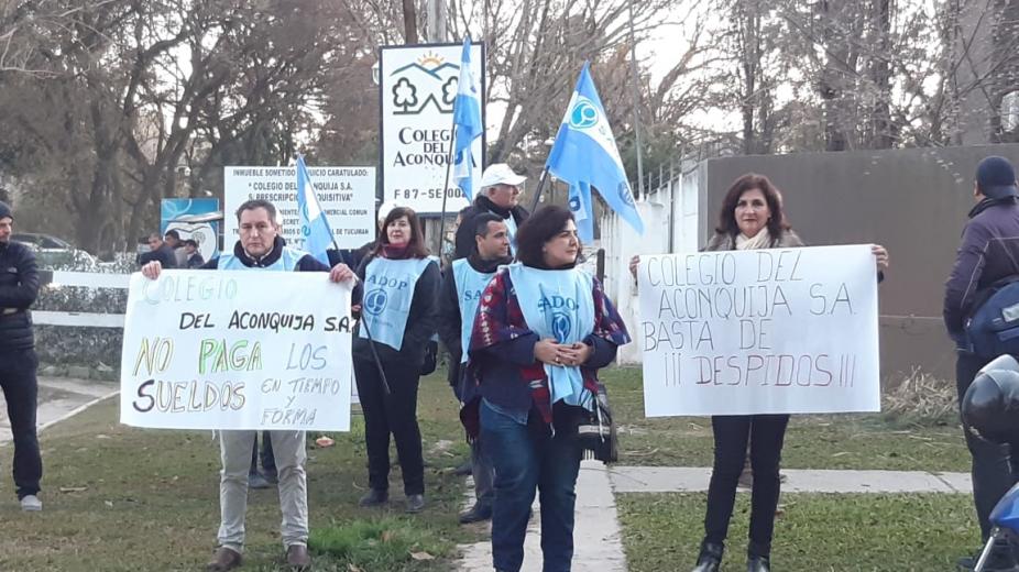 SADOP denuncia la grave situación que viven los docentes del Colegio del Aconquija S.A.En lo que va de este año esta institución despidió a 7 docentes, los trabajadores son víctimas de maltrato laboral al tener que concurrir diariamente a la administración para recibir en cuotas su sueldo que además llega al 70% de lo establecido por ley. El colegio no realiza los aportes de jubilación y obra social.
