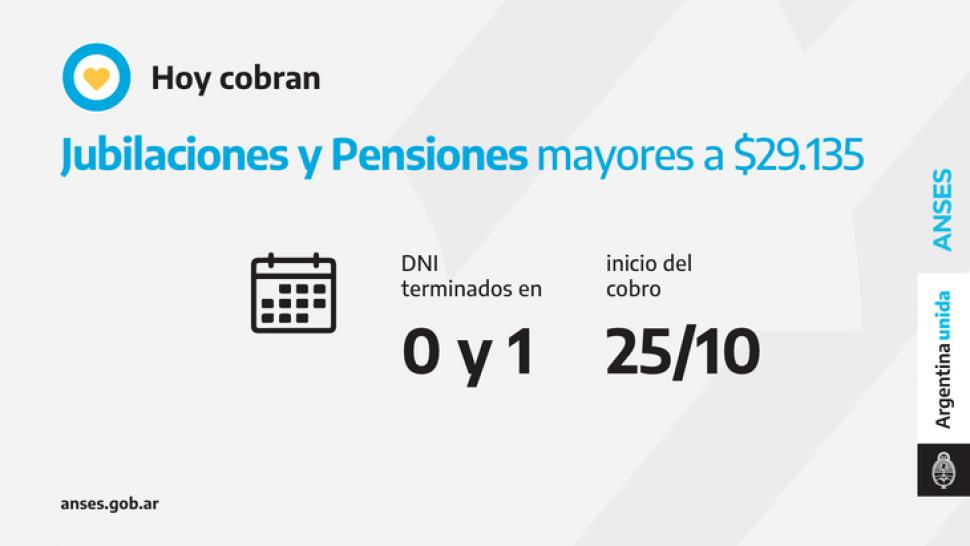 En el marco del Programa Alimentario PAMI, ANSES abona hoy el pago extraordinario equivalente al monto del bolsón de alimentos para jubilados, jubiladas, pensionados y pensionadas con documentos finalizados en 0 y 1 cuyos haberes SUPEREN la suma de 29.135 pesos. Para más información se puede ingresar a www.pami.org.ar/programa-alimentario.