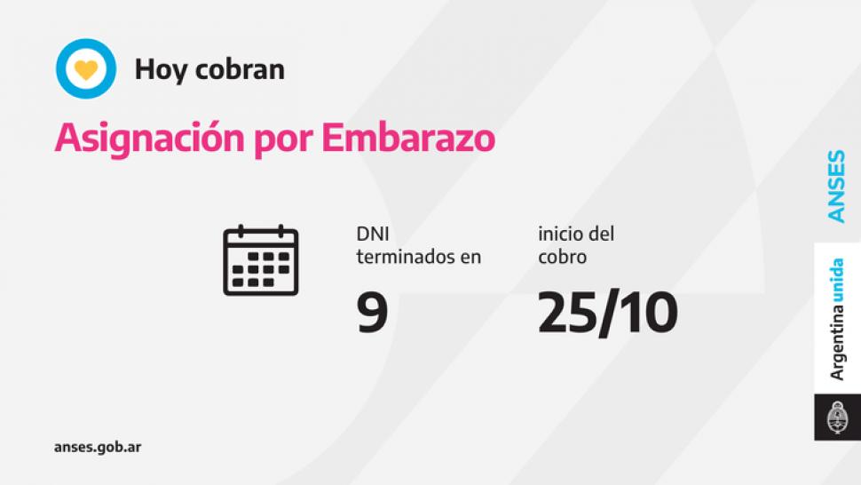 Con la utilización de la tarjeta de débito, hoy cobran la Asignación por Embarazo las titulares con documentos finalizados en 9