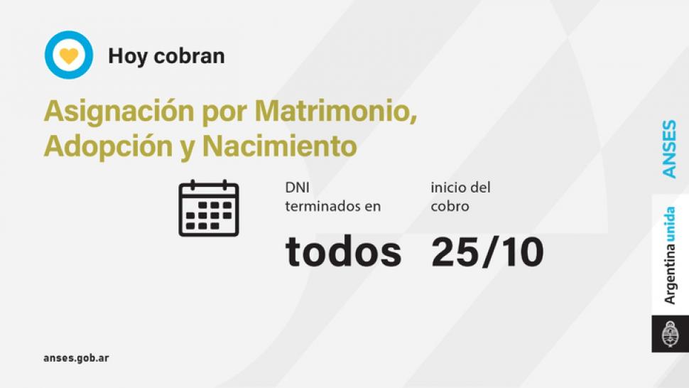 Desde hoy y hasta el 10 de noviembre se pagan las Asignaciones de Pago Único (Matrimonio, Adopción y Nacimiento) para todas las finalizaciones de documento.