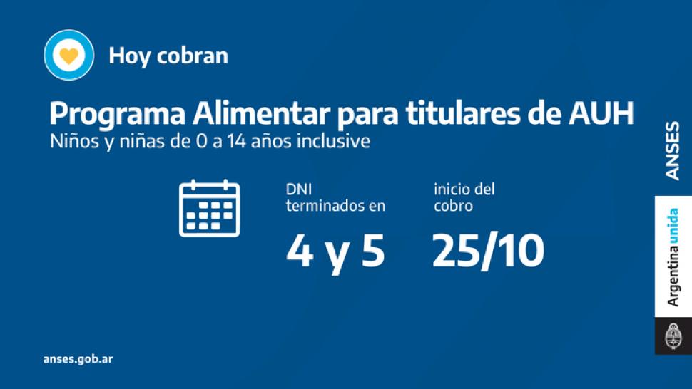 En el marco del Plan Argentina contra el Hambre del Ministerio de Desarrollo Social, ANSES acompaña con el pago del programa Alimentar. Hoy cobran titulares de la AUH con hijos e hijas de 0 a 14 años inclusive con documentos finalizados en 4 y 5, que no poseen la tarjeta plástica y reciben el dinero en la misma cuenta de la prestación.