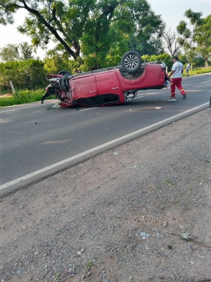 Producto del impacto, el Corsa quedó con todo el tren delantero destrozado, a la vera del camino, mientras que la Nissan Frontier terminó volcada sobre la ruta 304.