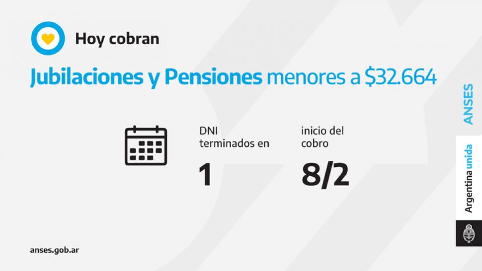 Las sucursales bancarias habilitadas atenderán por ventanilla a jubilados, jubiladas, pensionados y pensionadas con documentos terminados en 1 cuyos haberes NO SUPEREN la suma de 32.664 pesos.