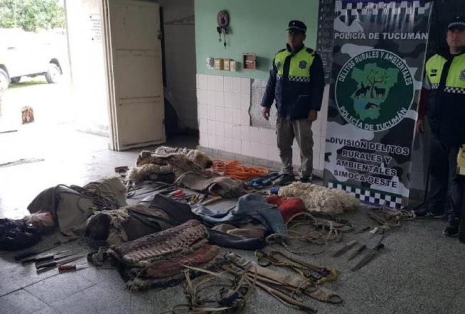En los domicilios allanados, ubicados en las localidades de Los Mendoza y Villa Chicligasta, departamento Simoca, los uniformados incautaron más de diez cuchillos, machetes, municiones, 15 kilos de carne, sillas de montar, látigos y diversas herramientas, entre otros elementos relacionados al delito de abigeato