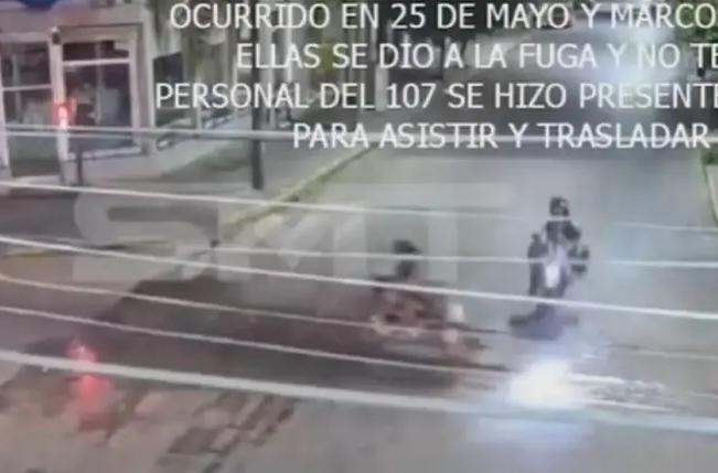 Allí se observa como uno de los protagonistas abandona el lugar del accidente y deja a dos personas tendidas en la acera, los que debieron ser asistidos por el personal de emergencia del 107.