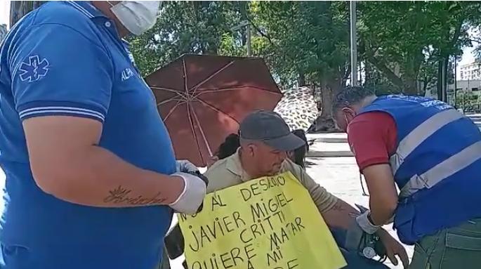 El hombre asegura que todo lo está haciendo por su madre, que vivió muchos años en ese lugar , está sentado sin moverse a ningún lado , reclamando ser escuchado