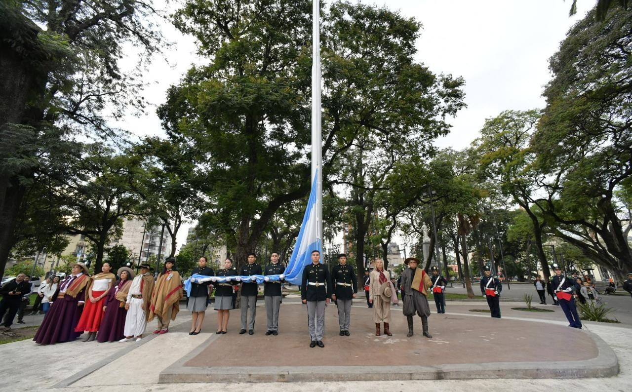 La emotiva celebración, que estuvo marcada por la presencia escolar y de vecinos y turistas, comenzó con el tradicional chocolate patrio con bollo y continuó con el izamiento de la Bandera Nacional a cargo de cadetes del Liceo Militar General Gregorio Araoz de Lamadrid.