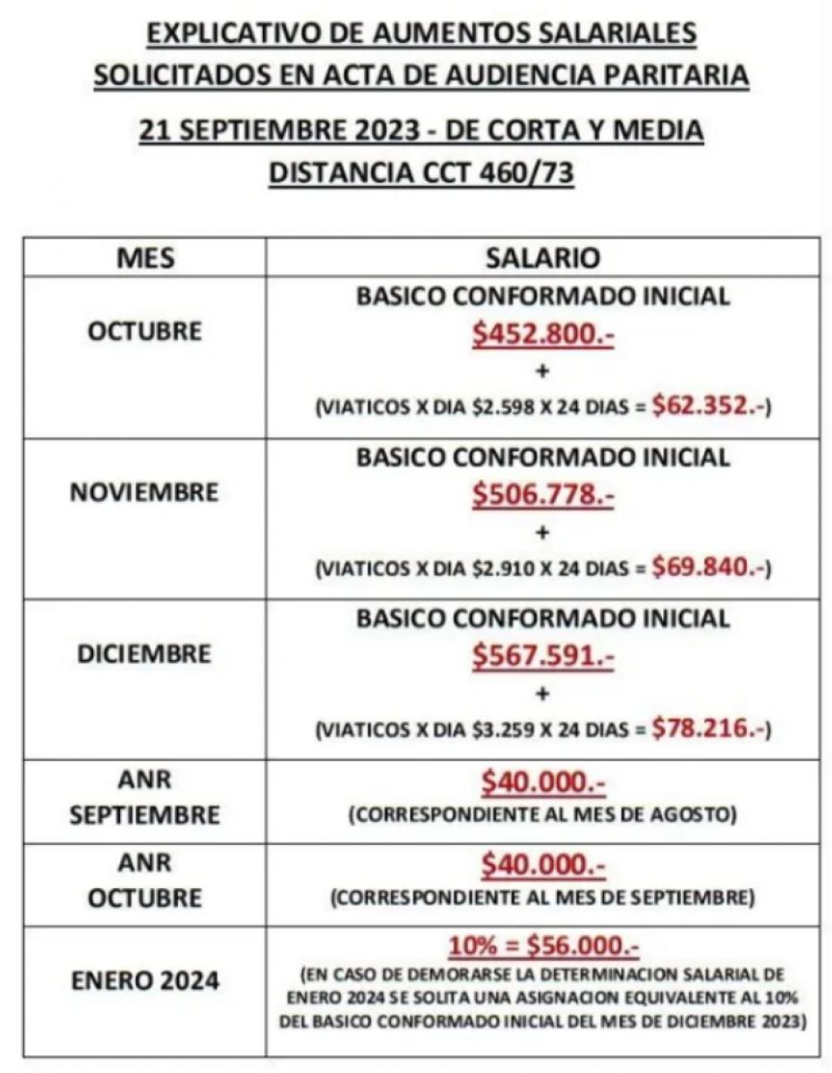 Asimismo, y continuando la determinación de los salarios en el marco acuerdo salarial 2023, se entiende necesario el incremento proporcional alcanzando como base de los haberes del mes de octubre salarial los $ 452.480,00; noviembre en $ 506.778,00 y diciembre en $567.592,00.- Igual incremento solicitamos para el rubro viáticos/reintegro de gastos quedando fijados para el mes de octubre en $2.598,00; noviembre $2.910,00; y diciembre en $3.259,00 por día de trabajo.
