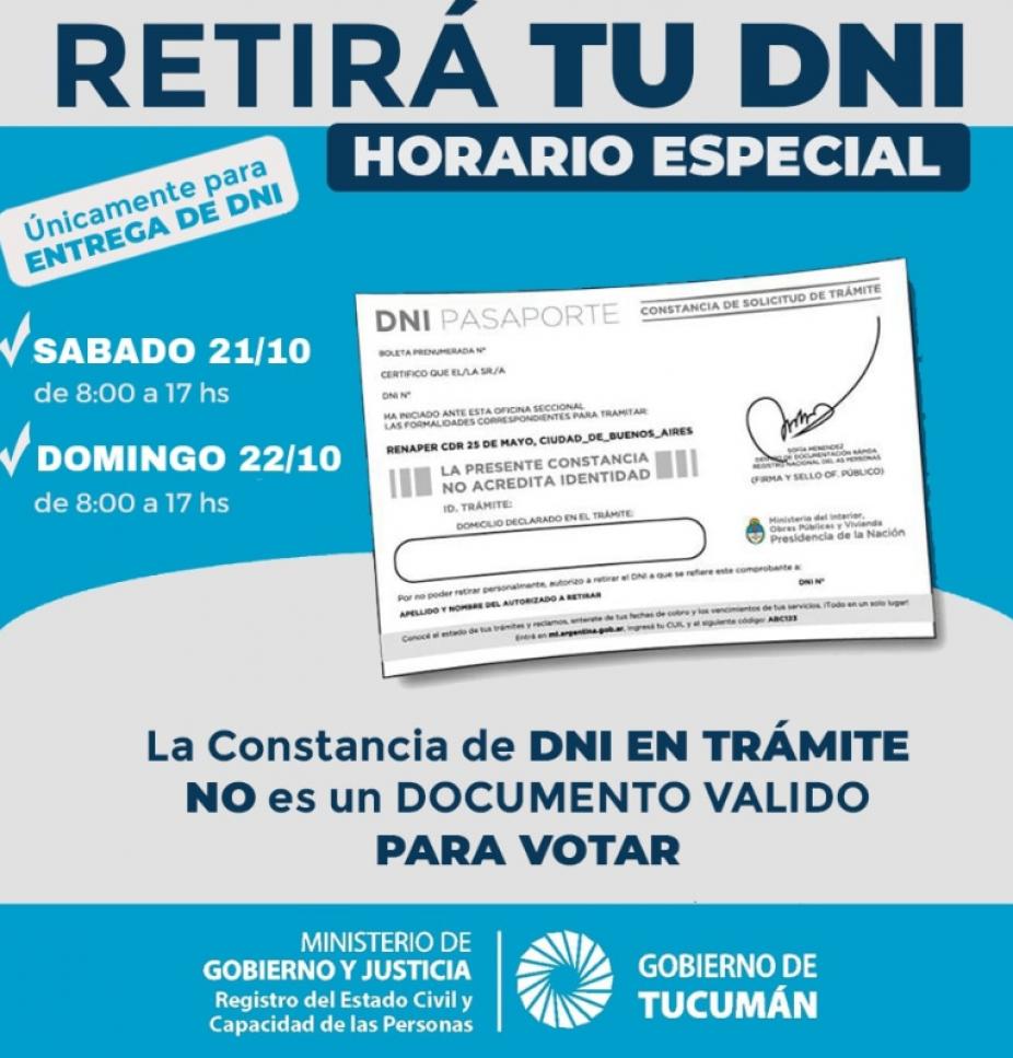 El Registro Civil de Tucumán, a cargo de Carolina Bidegorry; recuerda a la población que los próximos 21 y 22 de octubre se desarrollará el horario especial de atención al público exclusivamente para entrega de DNI.
