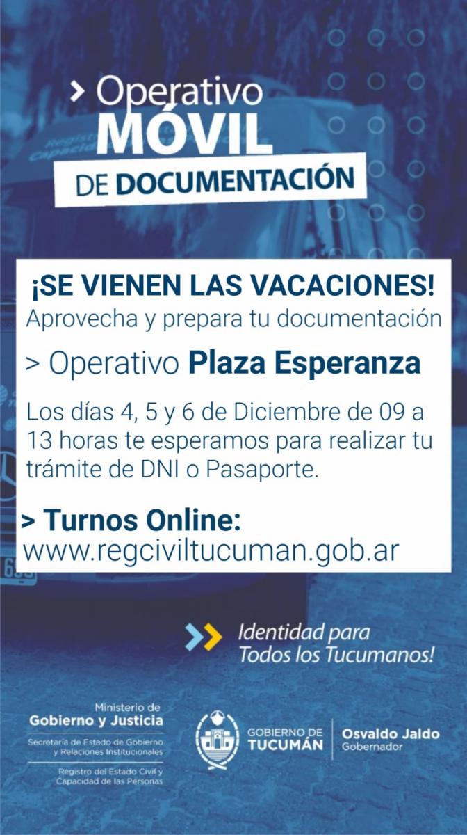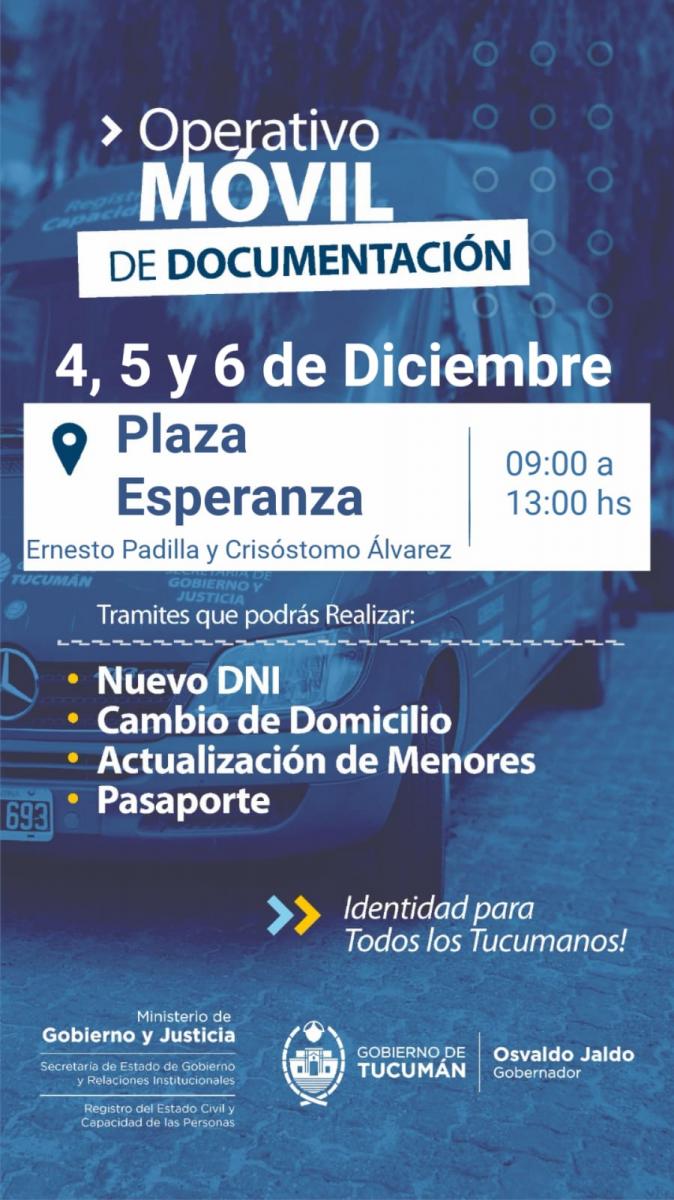 Los días 4,5 y 6 de diciembre, de 9 a 13 horas, se llevará a cabo un Operativo Móvil de Documentación en la Plaza Esperanza, ubicada en Ernesto Padilla, entre Crisóstomo Álvarez y San Lorenzo. La atención será con turnos que serán solicitados vía online en www.regciviltucuman.gob.ar.