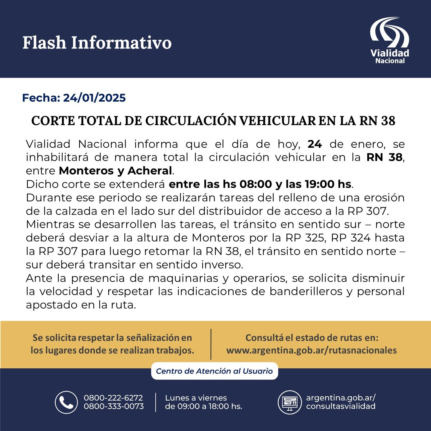 La Ruta Nacional 38 se encuentra actualmente cerrada al tráfico vehicular debido a un corte total. Las autoridades han implementado desvíos y están recomendando a los conductores buscar rutas alternativas para evitar largas esperas y congestiones.