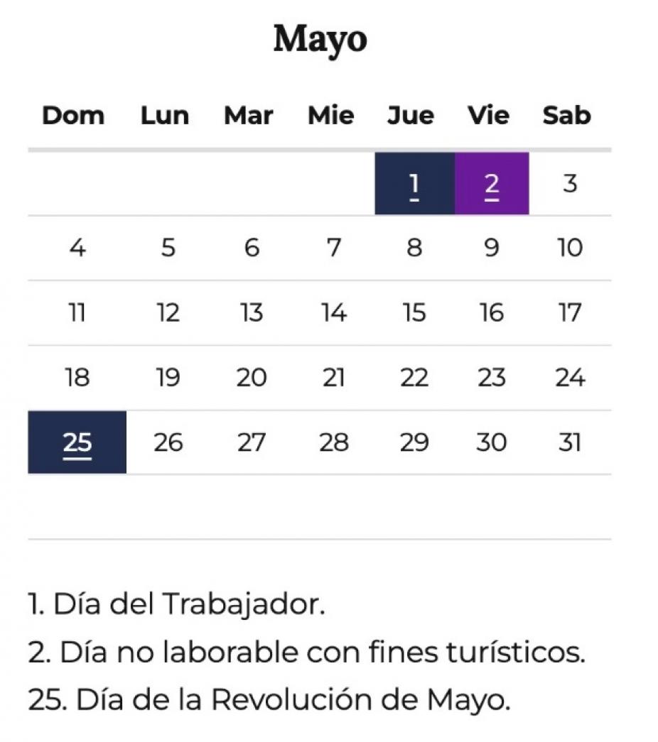 De acuerdo con el calendario oficial de feriados de 2025 aprobado por el Gobierno Nacional, el viernes 2 de mayo es un "Día no laborable con fines turísticos", por ello, no se trata específicamente un feriado obligatorio.
