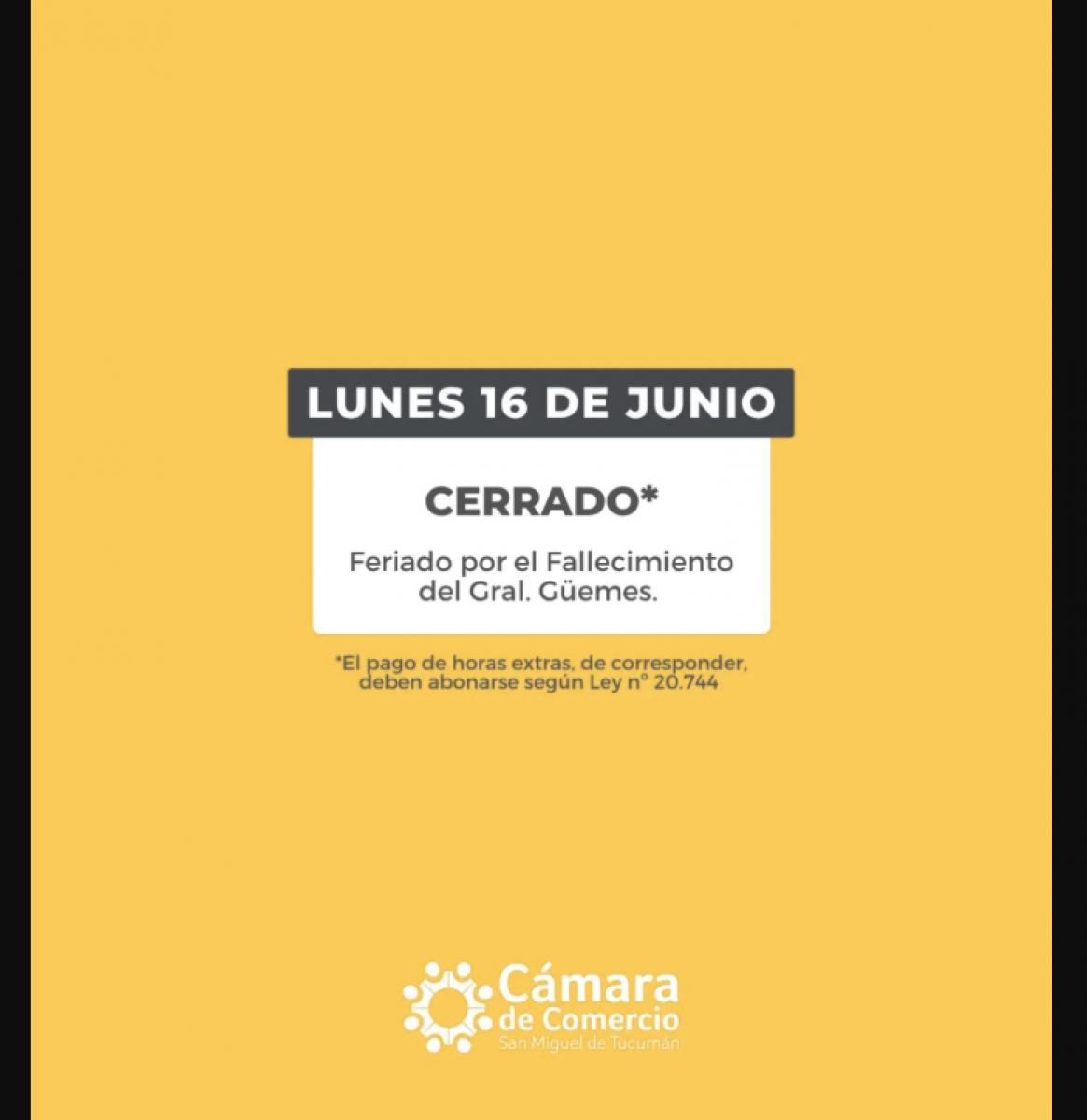 El día Lunes 16 de Junio es feriado (Trasladado del martes 17) en conmemoración del fallecimiento del Gral. Güemes, los comercios permanecerán cerrados.