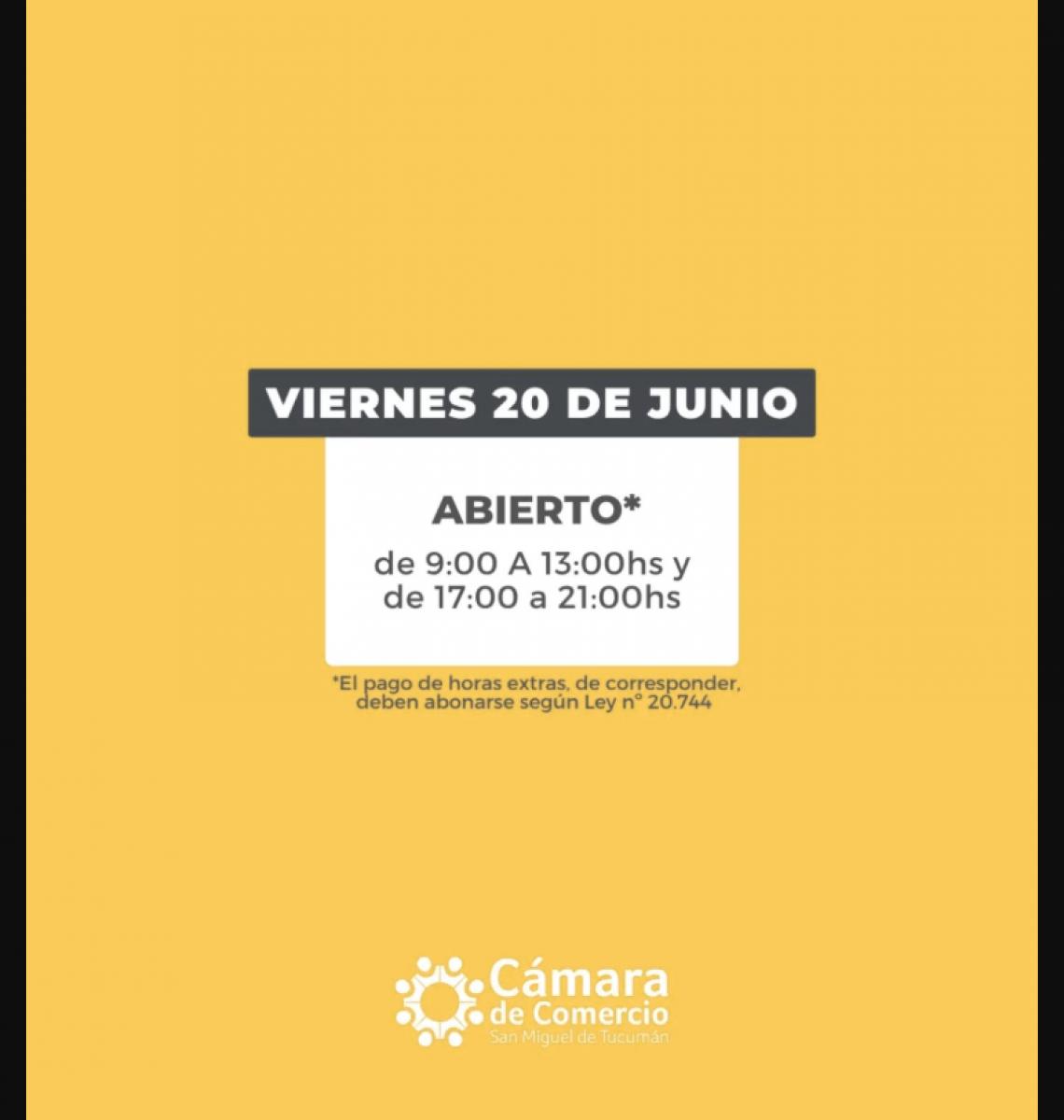 La Cámara de Comercio de San Miguel de Tucumán da a conocer la modalidad de apertura comercial durante los días especiales de Junio.