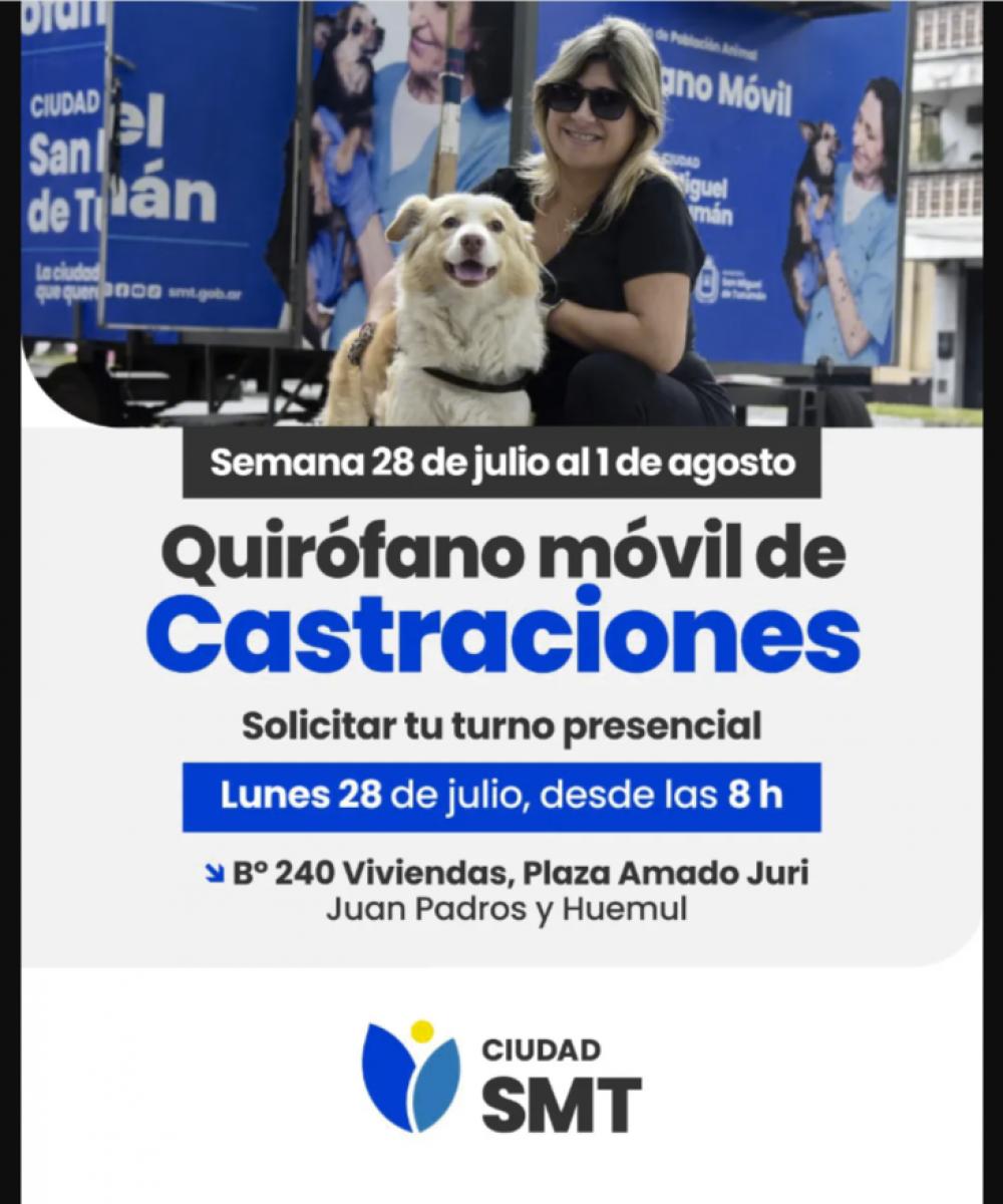La Municipalidad de San Miguel de Tucumán, a través de la Dirección de Población Animal, acercará la próxima semana los servicios gratuitos del programa “Un vete en tu barrio” a los vecinos del Barrio 240 Viviendas, en el sector suroeste de la capital. Desde el lunes 28 de julio hasta el viernes 1° de agosto, el quirófano veterinario móvil de castraciones se instalará en la Plaza Amado Juri, que está ubicada sobre calle Juan Padrós y huemul.