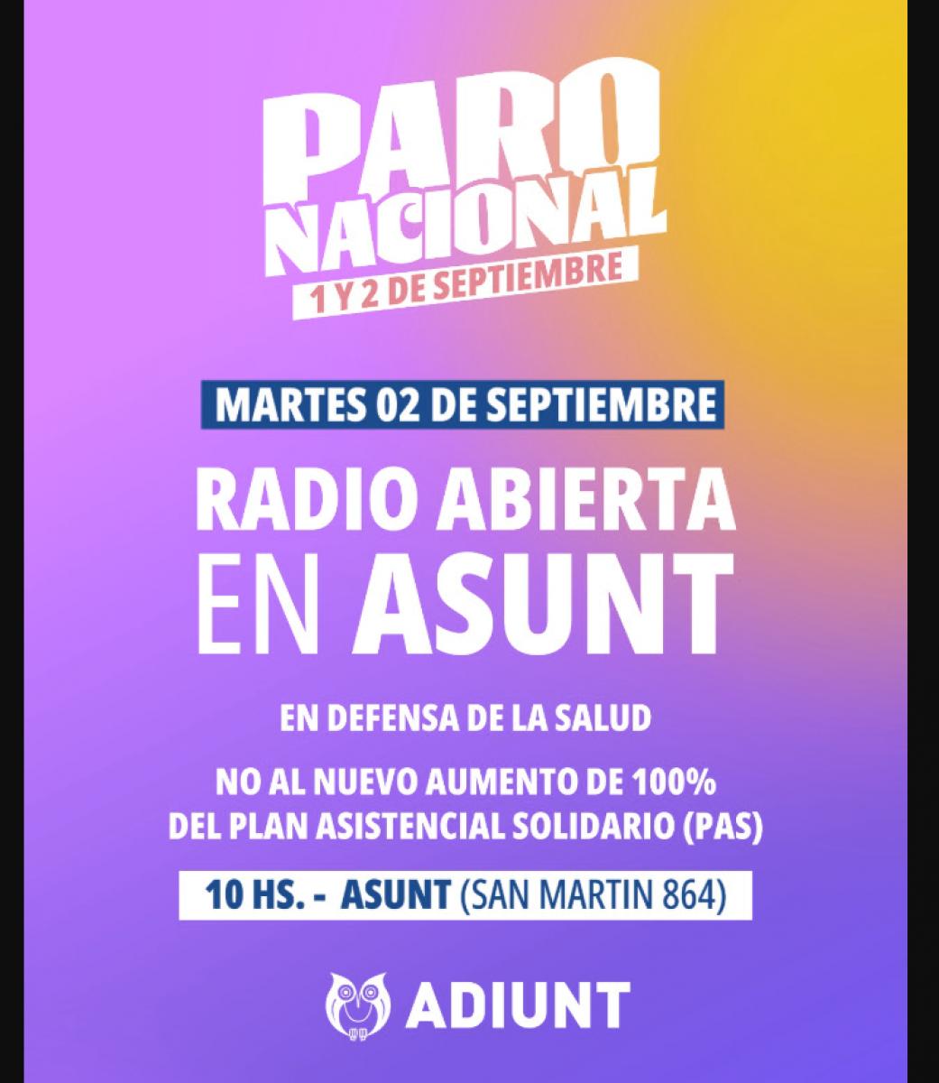 El martes 2 de septiembre, la actividad se concentrará en ASUNT (San Martín 864), donde a partir de las 10 hs se llevará a cabo una radio abierta en defensa de la salud de las y los afiliados. En este espacio se denunciará el nuevo aumento del 100% del Plan Asistencial Solidario (PAS), una medida que golpea directamente a los bolsillos de docentes, trabajadores y sus familias.