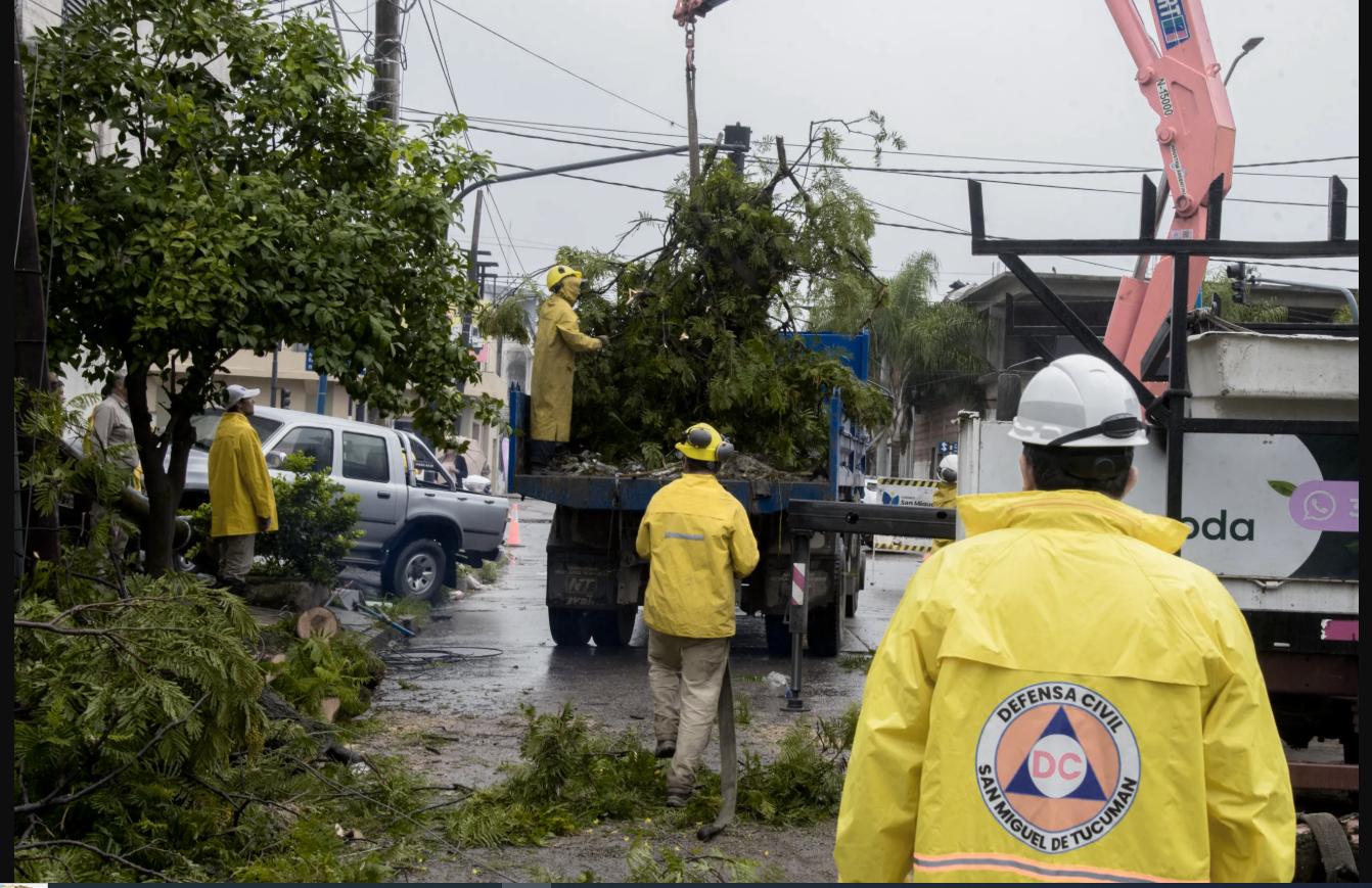Las direcciones de Limpieza Urbana, Arbolado y Defensa Civil de la Municipalidad de San Miguel de Tucumán trabajan en tareas de limpieza y reparación en distintos puntos de la ciudad donde se registraron árboles caídos como consecuencia del fuerte temporal de lluvia y viento que se desató este martes por la noche en la capital.