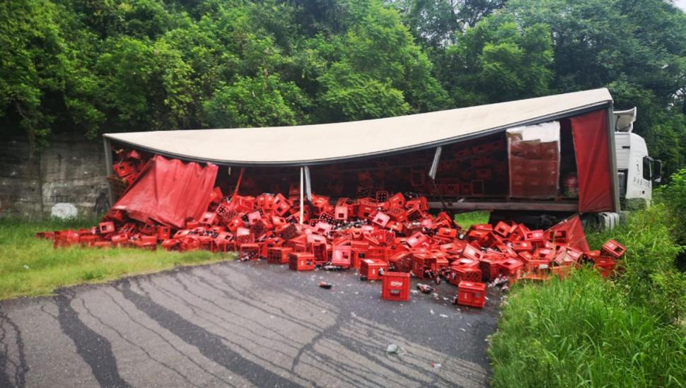 Un camión que trasladaba una carga de gaseosas bloqueó el paso en la subida a Villa Nougués, sobre la ruta 338. No hubo heridos.