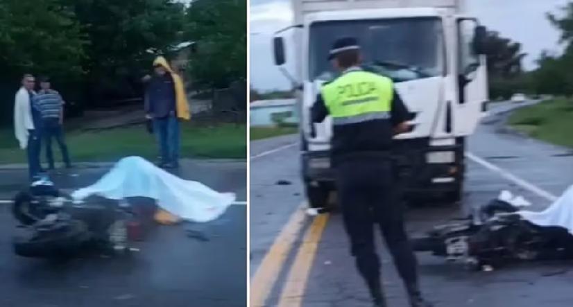 El accidente se produjo cuando un camión Iveco Tector, que circulaba en sentido Norte-Sur transportando un cargamento de cubiertas, colisionó con una motocicleta por causas que aún son materia de investigación.